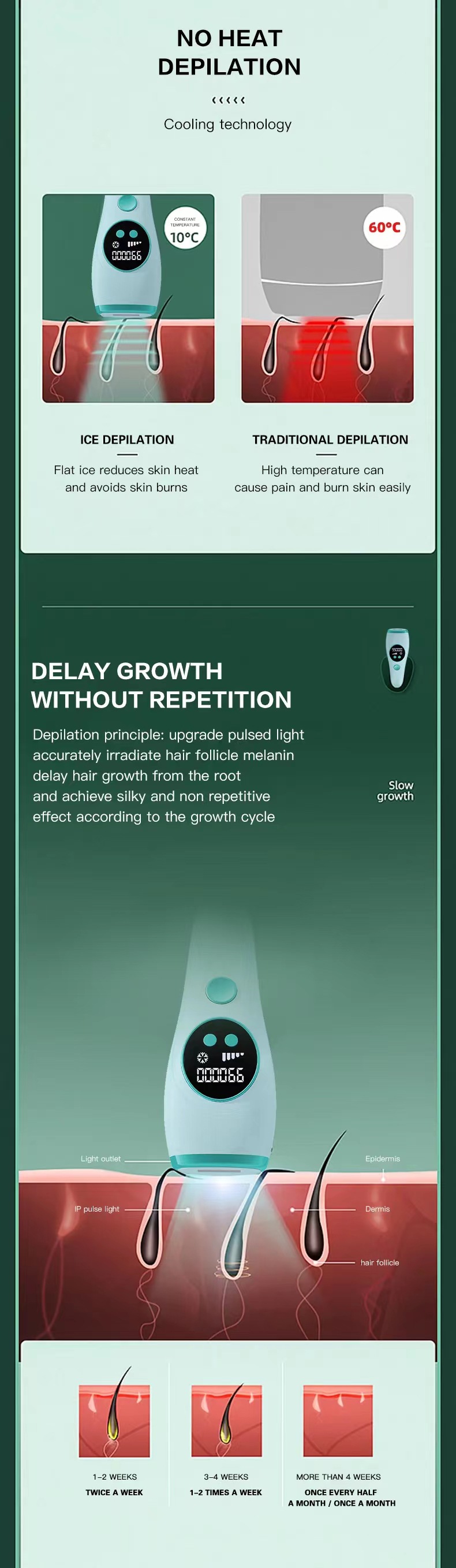 Cold Application Technology: Provides soothing cooling during hair removal for enhanced comfort